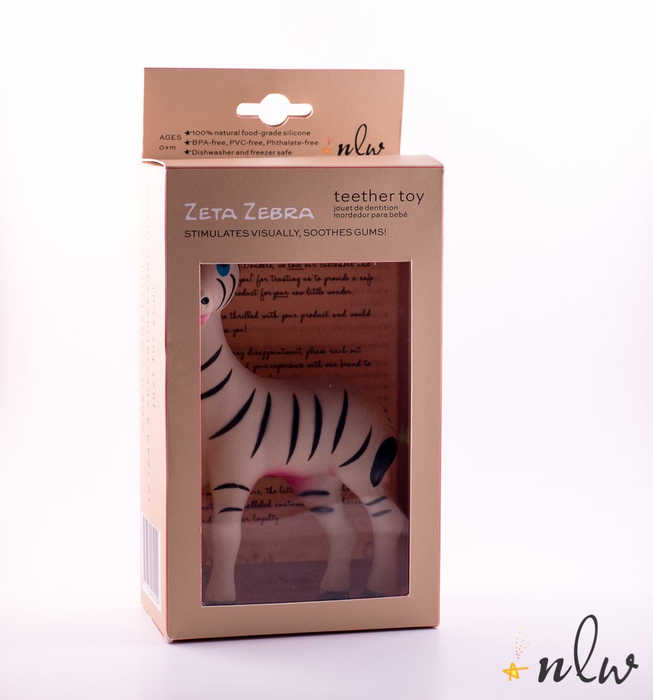 Our lovable, hand-painted Zeta Zebra teething toy visually stimulates baby for brain developing and gum-soothing playtime!